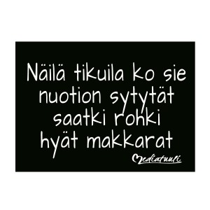Näilä tikuila ko sie nuotion sytytät tullee rohki hyät makkarat