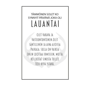 LauantaiKortti on tarkoitettu lauantaina syntyneille. Kuvaa luonteenpiirteitä meän murteella. Mustavalkoinen..