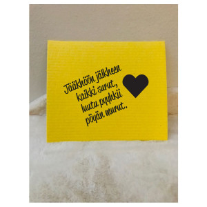 Tiskirätti meän murtheela. Jääkhöön jälkheen kaikki surut, luutu pyyhkii pöyän murut...